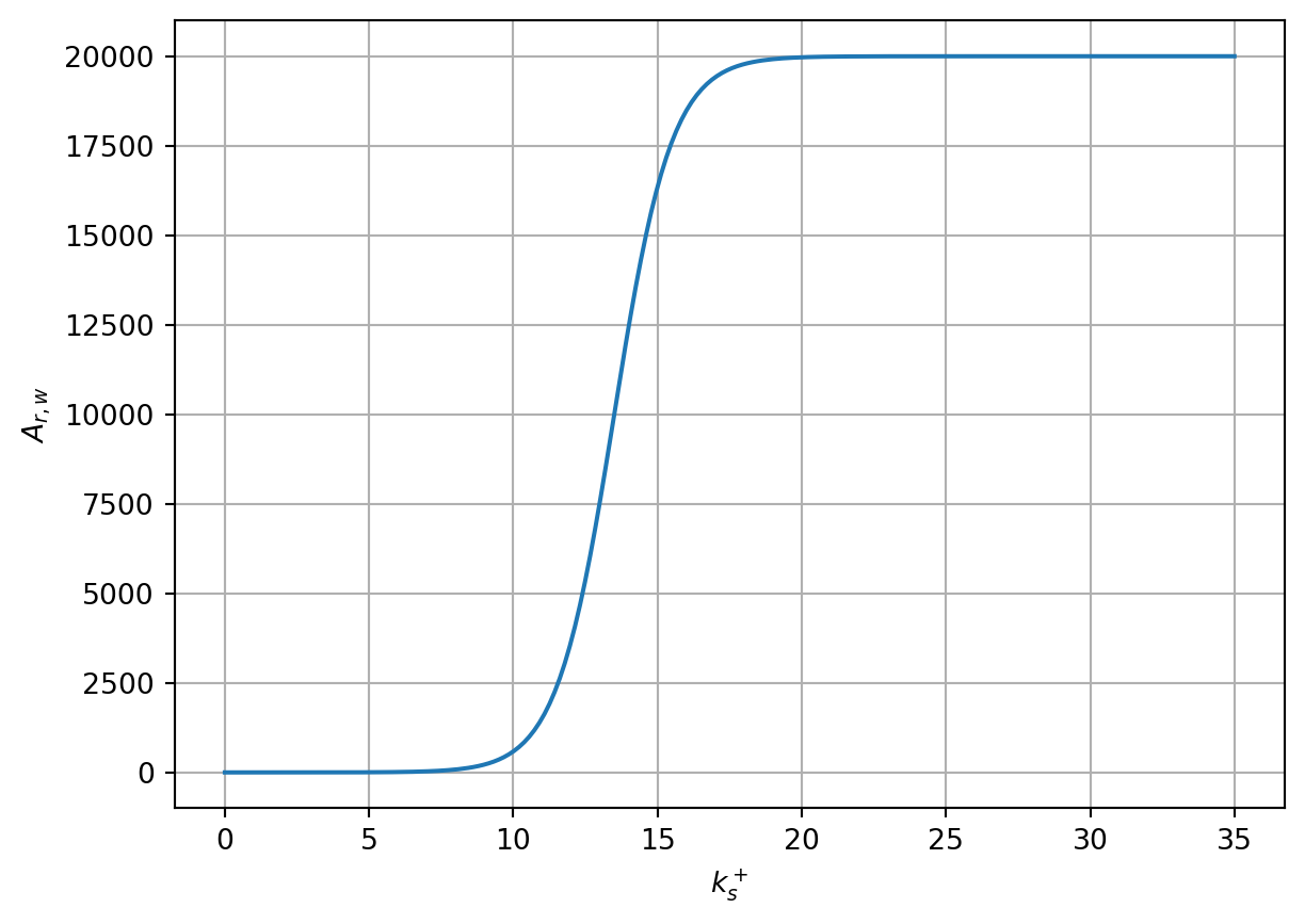 The model according to Langel et al. (Langel et al. 2017a) uses the same approach as Dassler et al., but with different calibration and provides a specific functional form for \(Arg_r\). In this model, the value is \(\sigma_{A_r} = 30\) and the boundary condition at the wall is for the case of flat plate flow (see (Langel et al. 2017a, 109)) \[ A_{r,w} = \frac{20000}{1 + e^{13.5 - k_s^+}}. \]