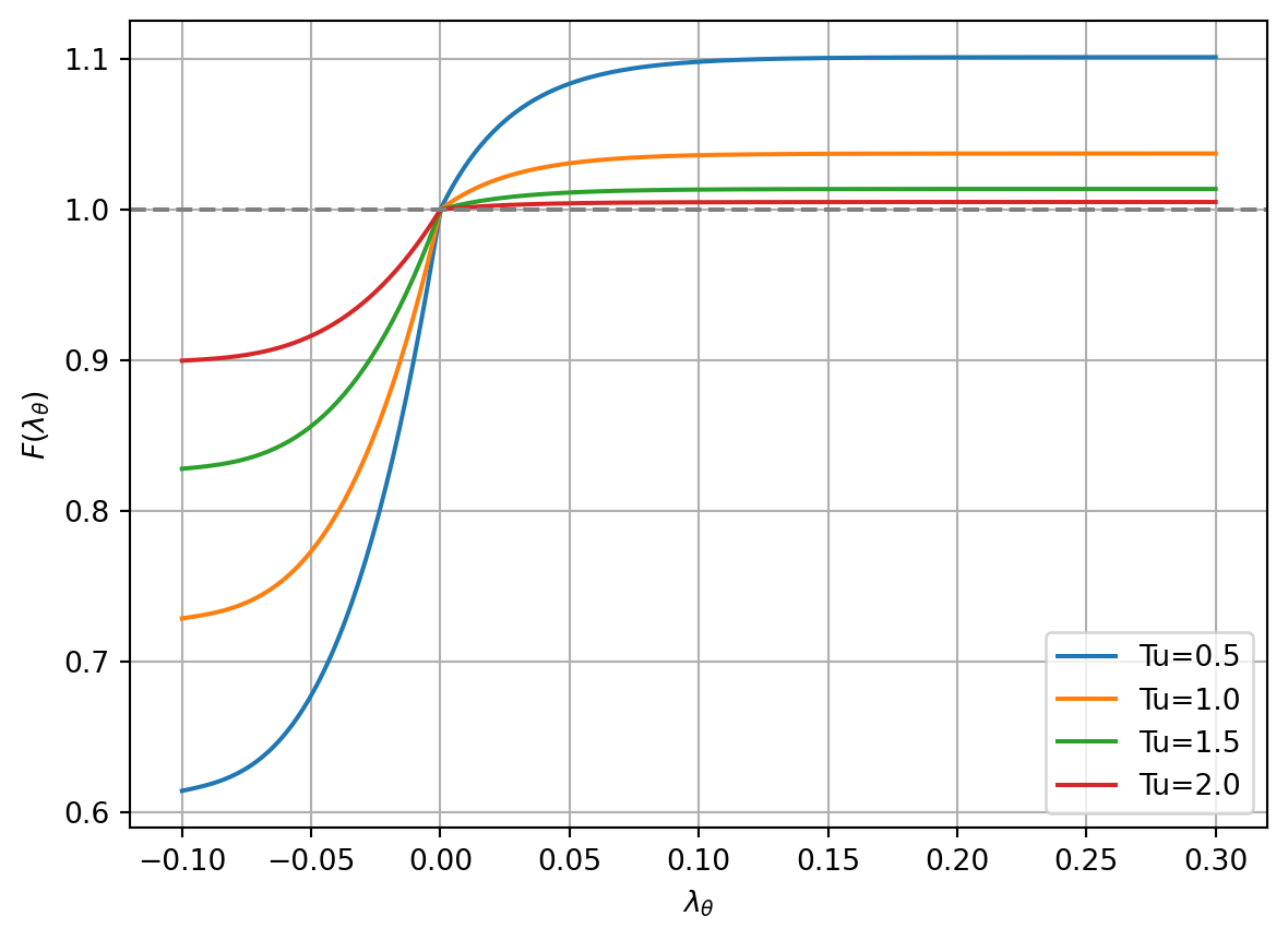 The function \(F(\lambda_\theta)\) is defined as in the original model by Langtry and Menter Langtry and Menter (2009) as \[ F(\lambda_\theta) = \begin{cases} 1 + (12.986 \lambda_\theta + 123.66 \lambda_\theta^2 + 405.689 \lambda_\theta^3) e^{-\left(Tu/1.5\right)^{1.5}} , & \text{for } \lambda_\theta \le 0, \\ 1 + 0.275\left(1 - e^{-35\lambda_\theta}\right)e^{-\left(Tu/0.5\right)}, & \text{for } \lambda_\theta > 0, \end{cases} \]