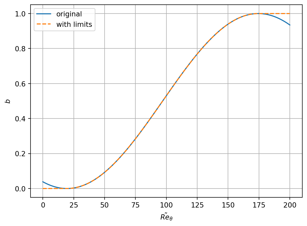 The damping factor \(b\) is given by the relation \[ b = 0.5\sin\left(\frac{\pi}{155}\tilde{Re}_\theta - \frac{97\pi}{155}\right) + 0.5. \] In this function, it is apparently appropriate to limit the value of \(\tilde{Re}_\theta\) to the interval \([19.5, 174.5]\), i.e., \[ b = 0.5\sin\left(\frac{\pi}{155}\max(\min(\tilde{Re}_\theta, 174.5), 19.5) - \frac{97\pi}{155}\right) + 0.5. \tag{2}\]