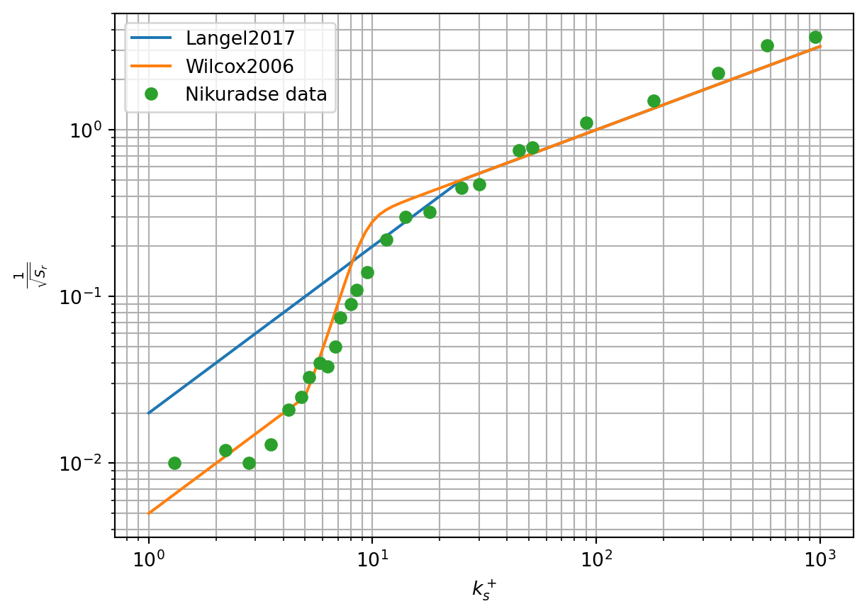 Compared to the model according to (Langel et al. 2017a), a modification of the boundary condition for \(\omega\) in the case of a smooth wall is used in the implementation \[ \omega_w = \begin{cases} 10 \frac{6\nu}{\beta_1 y_1^2} & \text{for } k_s^+ \le \sqrt{\frac{2500\beta_1}{60}} y^+_1, \\ \frac{u_\tau^2 S_r}{\nu} & \text{for } k_s^+ > \sqrt{\frac{2500\beta_1}{60}} y^+_1. \end{cases} \tag{4}\]
